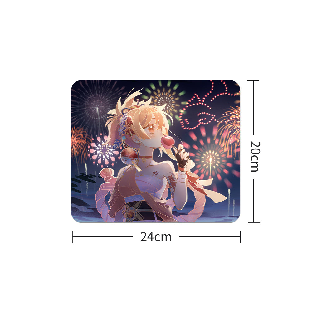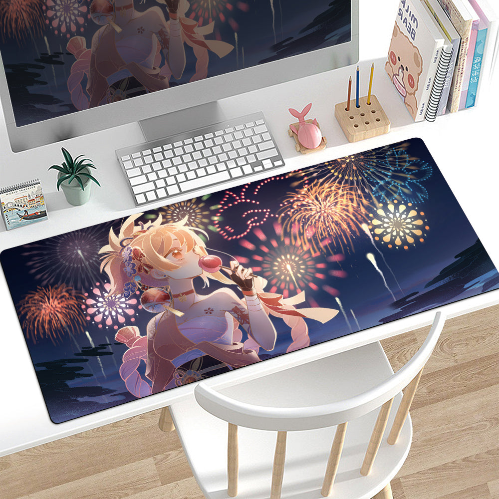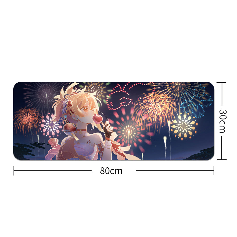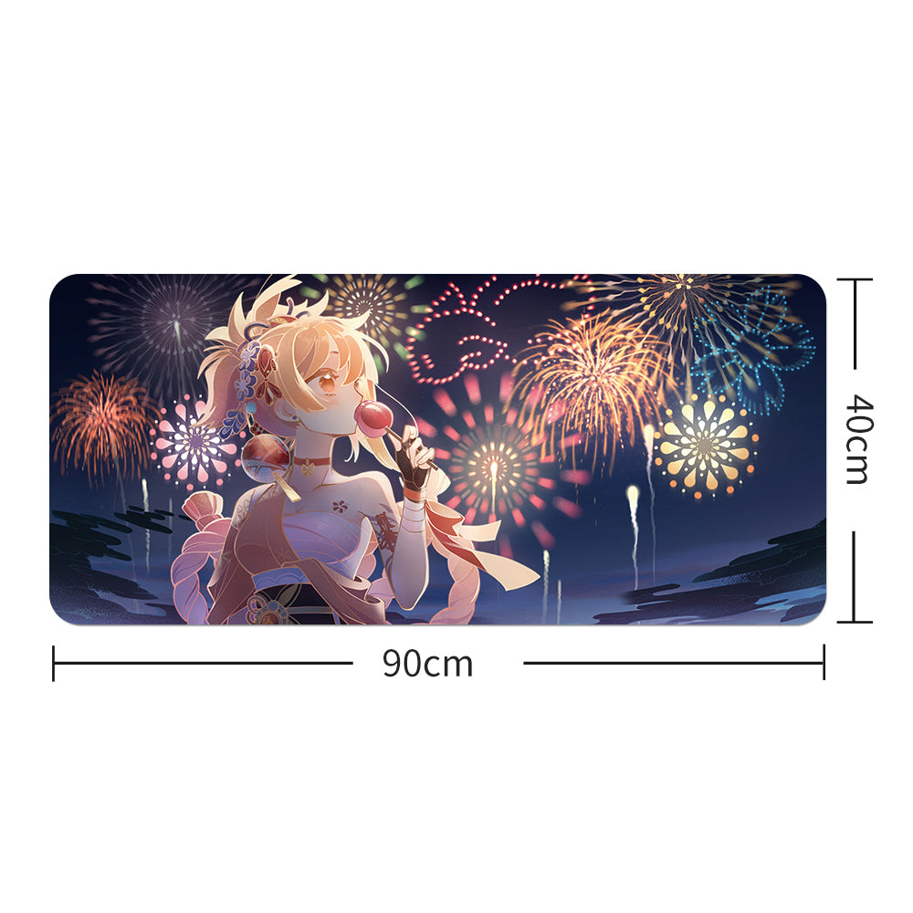 🎆 Ünnepi hangulat egész évben! Vidám gaming egérpad szőke anime lánnyal hagyományos japán yukata ruhában, színes fesztivál háttérrel. A japán fesztiválok varázsa az asztalodon!